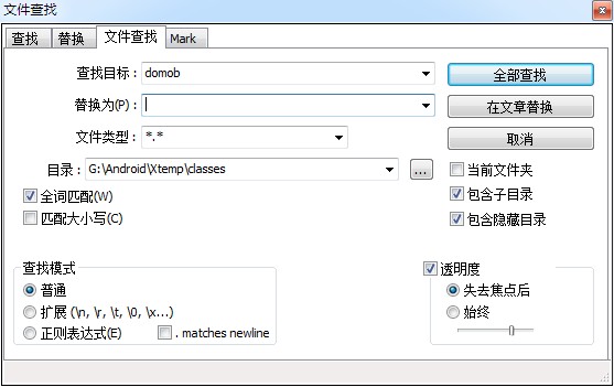 查找目标填关键词(稍后介绍),替换为填一些无意义的字母,目录为classes文件夹目录。剩下的是全词匹配,模式选择普通,填好之后点在文章替换,会问Are you sure?点确定,然后会蹦出来一个对话框,此时不要点确定