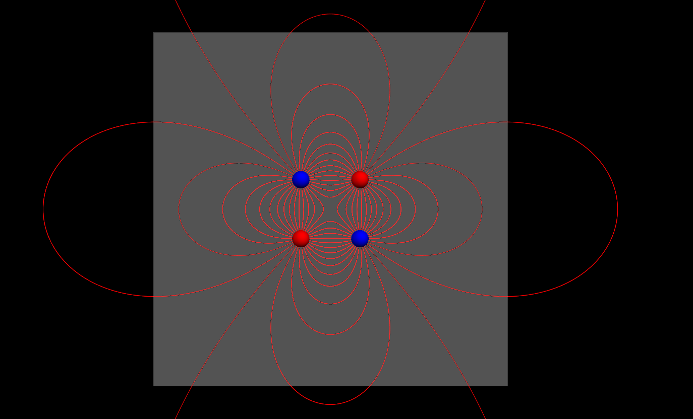 python写的动画,用的是Vpython库,需要从VTK官网下载,目前3.x的python只有3.3有这个库,3.4还没有。依旧用的是欧拉折线法绘制电场线的轨迹,和上一篇的Fortran是一样的算法。
