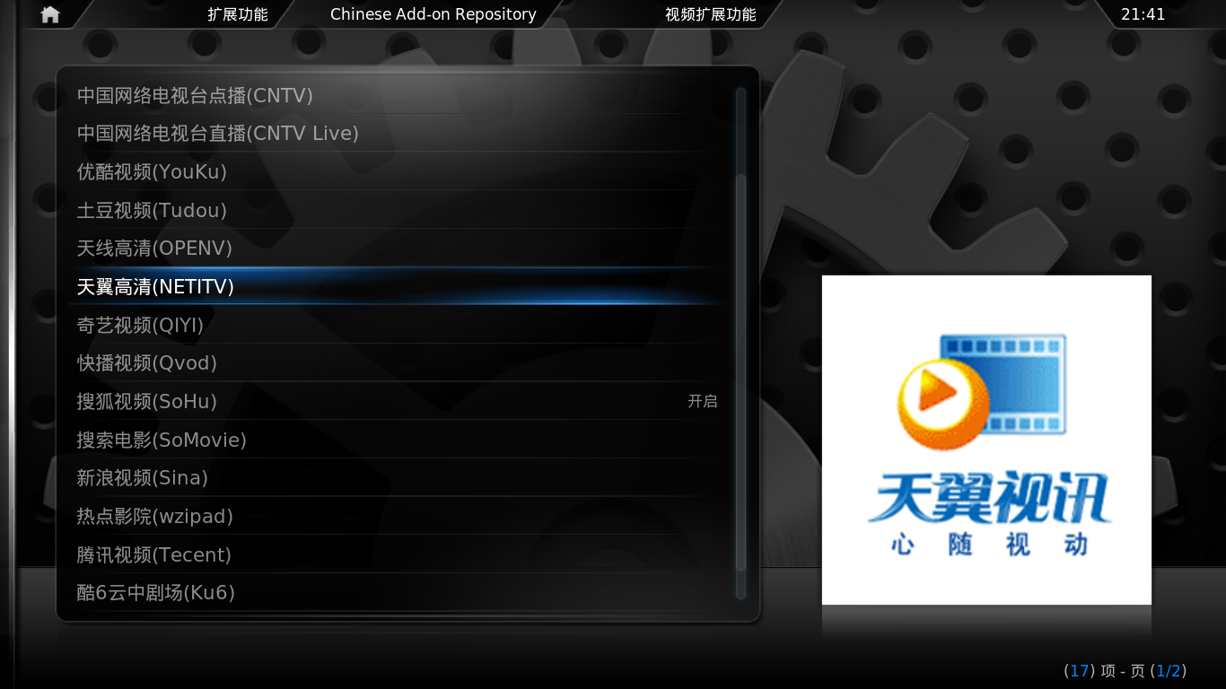 下载其中的repository.googlecode.xbmc-addons-chinese.zip的插件,然后系统设置——扩展功能——从zip中安装。安装之后,从扩展功能里选择获取扩展功能,点Chinese Add-on,可得到一个可安装插件的列表。
